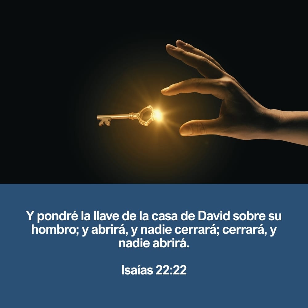 En aquel día llamaré a mi siervo Eliaquim hijo de Hilcías, y lo vestiré de tus vestiduras, y lo ceñiré de tu talabarte, y entregaré en sus manos tu potestad; y será padre al morador de Jerusalén, y a la casa de Judá. Y pondré la llave de la casa de David sobre su hombro; y abrirá, y nadie cerrará; cerrará, y nadie abrirá. Y lo hincaré como clavo en lugar firme; y será por asiento de honra a la casa de su padre. Colgarán de él toda la honra de la casa de su padre, los hijos y los nietos, todos los vasos menores, desde las tazas hasta toda clase de jarros.
