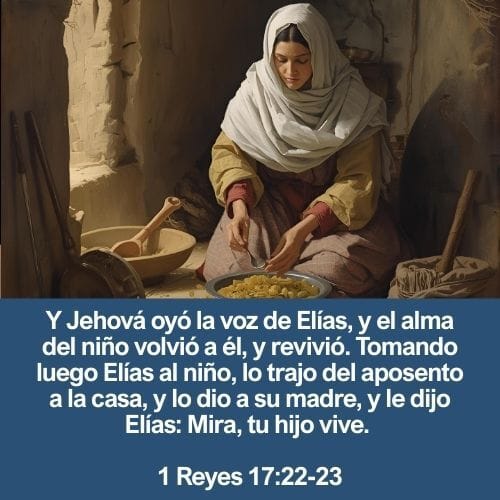 Y Jehová oyó la voz de Elías, y el alma del niño volvió a él, y revivió. Tomando luego Elías al niño, lo trajo del aposento a la casa, y lo dio a su madre, y le dijo Elías: Mira, tu hijo vive.