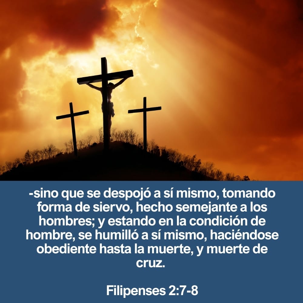 “Haya, pues, en vosotros este sentir que hubo también en Cristo Jesús, el cual, siendo en forma de Dios, no estimó el ser igual a Dios como cosa a que aferrarse, sino que se despojó a sí mismo, tomando forma de siervo, hecho semejante a los hombres; y estando en la condición de hombre, se humilló a sí mismo, haciéndose obediente hasta la muerte, y muerte de cruz. Por lo cual Dios también le exaltó hasta lo sumo, y le dio un nombre que es sobre todo nombre,”